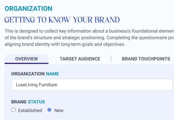 This is designed to collect key information about a business’s foundational elements to ensure a clear understanding of the brand’s structure and strategic positioning. Completing the questionnaire provides the necessary insights for aligning brand identity with long-term goals and objectives.