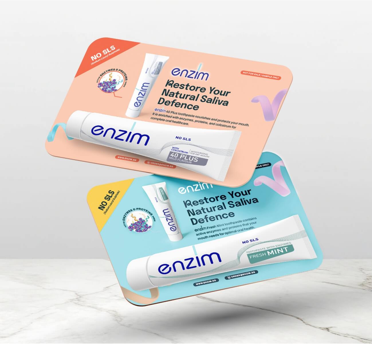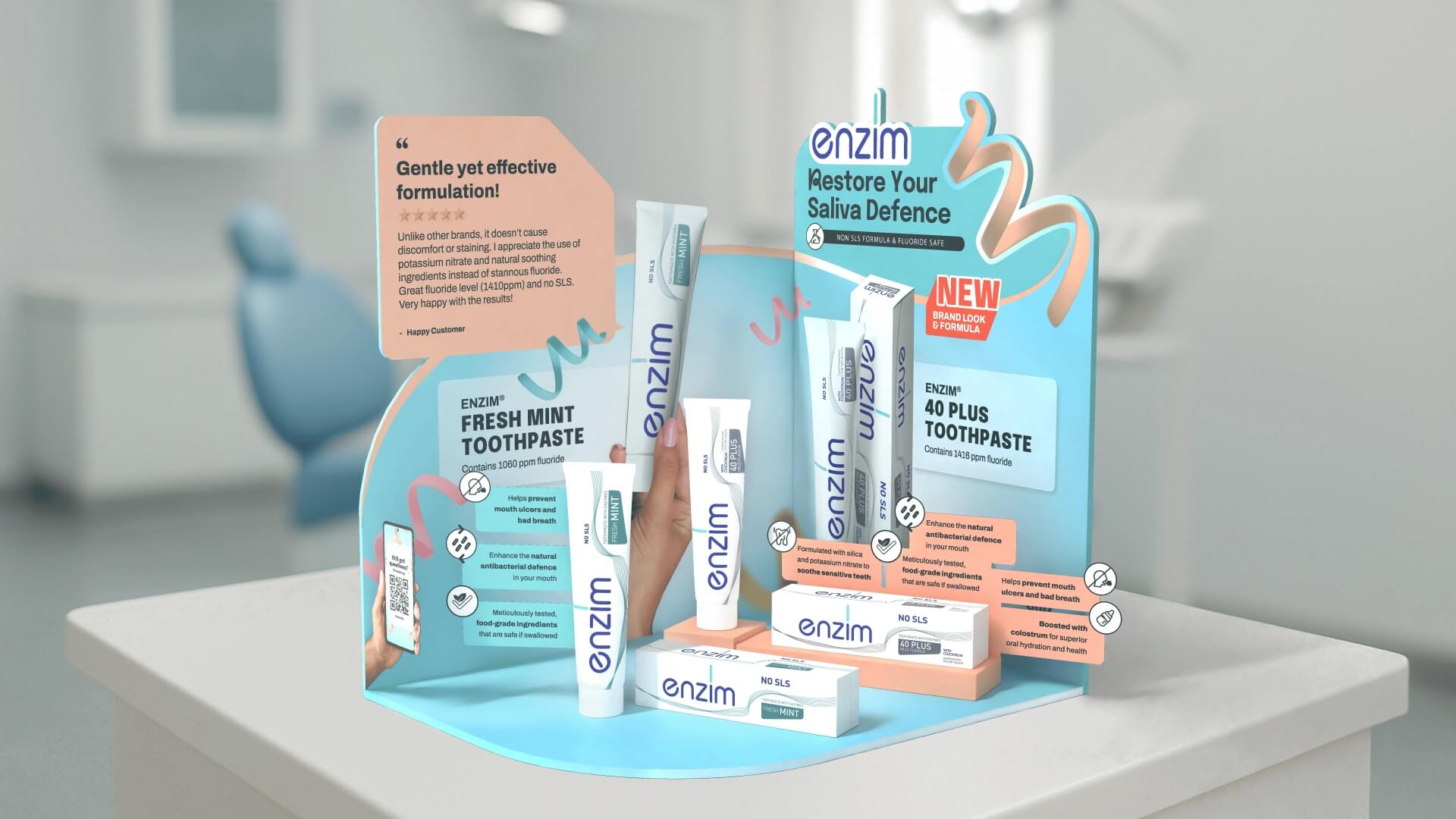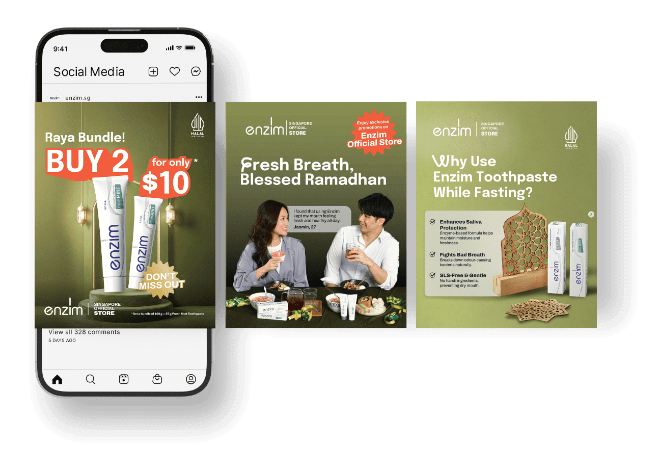 Entering Singapore’s oral care market meant competing against entrenched global brands with massive marketing budgets. Enzim needed to overcome three barriers simultaneously: shifting consumer perception away from “foaming = effectiveness” (SLS creates foam but damages oral microbiome), establishing credibility in a new market with zero brand recognition, and building a complete brand presence across digital and physical channels, from packaging and website to social media, marketing campaigns, and exhibition materials, within a tight launch timeline and budget.